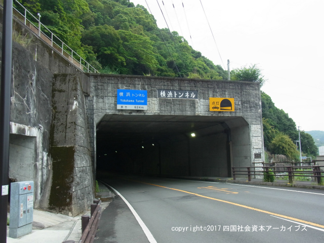 概要 | 佐賀町佐賀の市街地を通る国道56号は、長い間、道路の道筋が未改良で幅員も狭く、歩道の整備が不十分であった。このため、国道56号佐賀改良工事が行われた。平成元年に事業化が決定され、翌年から用地買収などに着手した。佐賀町中角~横浜間の延長2kmを対象に、平成4年に着工し、平成14年に全幅12mの道路が完成した。道路整備に伴う主な構造物は、横浜トンネル(延長624m)と伊与木川橋(延長95m)である。工事の完成により、佐賀市街地の交通環境は大きく改善された。 |