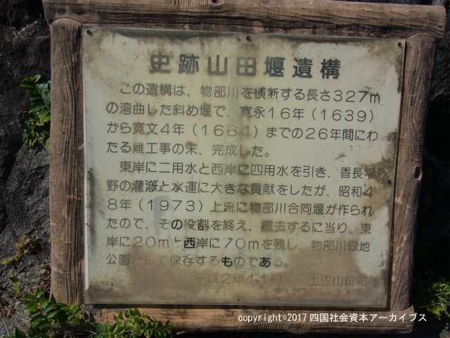 | 概要 | 昭和48年度の物部川統合堰の完成に伴い、山田堰は管理者が撤去することになった。しかし、山田堰は昭和4年に高知県史跡として指定された文化財であり、両岸に造成される高水敷部分の山田堰はその一部を存置し保存するとともに、高水敷部分は土佐山田町が河川敷公園として整備することになった。高水敷の造成は昭和56年度から河川改修費により実施し、昭和57年度から河川環境整備事業費により山田地先(右岸側)の低水護岸・高水敷整正に着手し、昭和63年度に完成した。 |